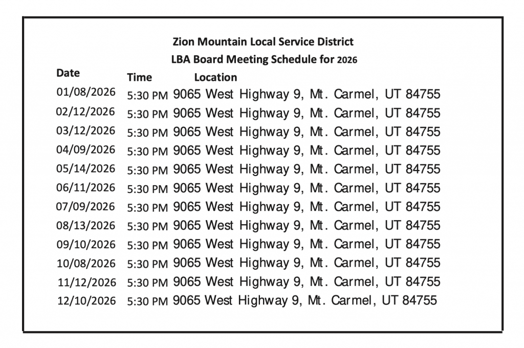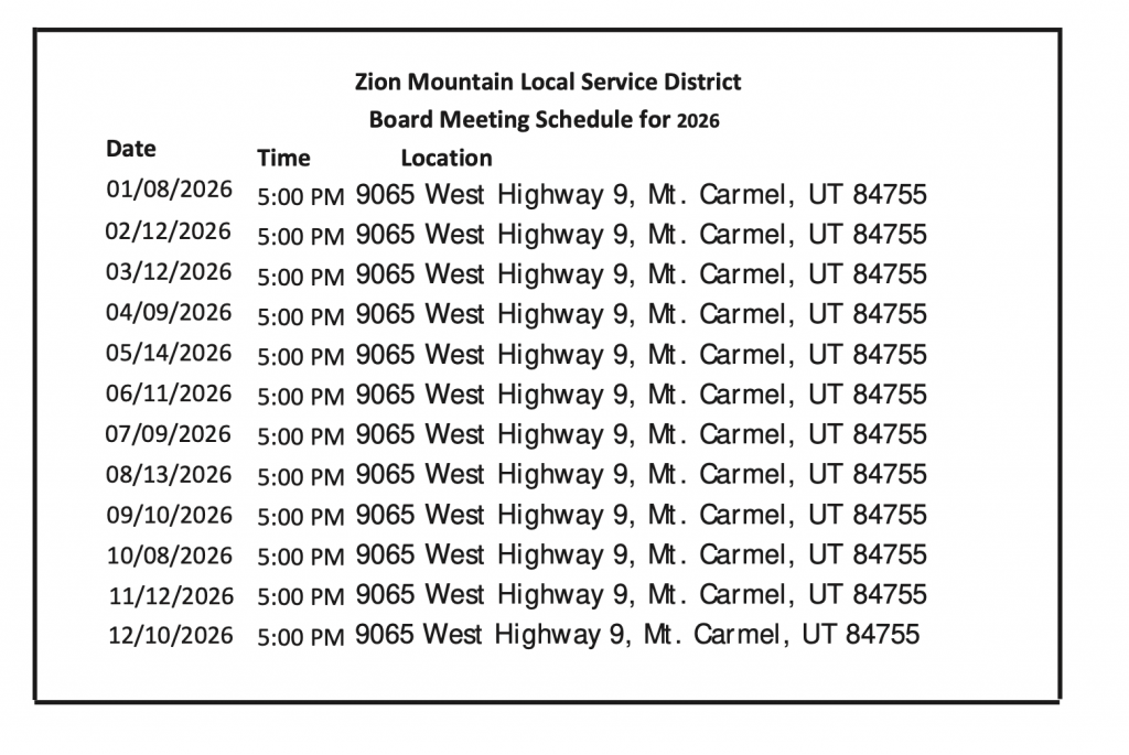 The District shall hold a public hearing on July 13, 2023, at the hour of 6:00 p.m. The location of the public hearing is 9065 West Highway 9, Mt. Carmel, Utah. The purpose of the hearing is to receive input from the public with respect to (a) the issuance of the Series 2023 Bonds and (b) any potential economic impact that the Series 2023 Project (defined below) may have on the private sector. All members of the public are invited to attend and participate.